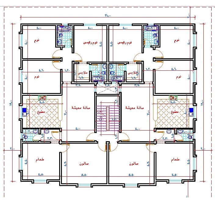 هذا تصميم مخطط منزل يتميز بتوزيع دقيق ومحكم للمساحات. يتكون المخطط من وحدات سكنية متماثلة مع ممرات وصول في المنتصف. كل وحدة تحتوي على غرفة معيشة رئيسية تفصل بين الغرف الخاصة والأماكن العامة في الشقة. تتضمن الشقة عدة غرف نوم، بما في ذلك غرفة نوم رئيسية مع حمام داخلي وغرف نوم إضافية تخدمها حمامات مشتركة.